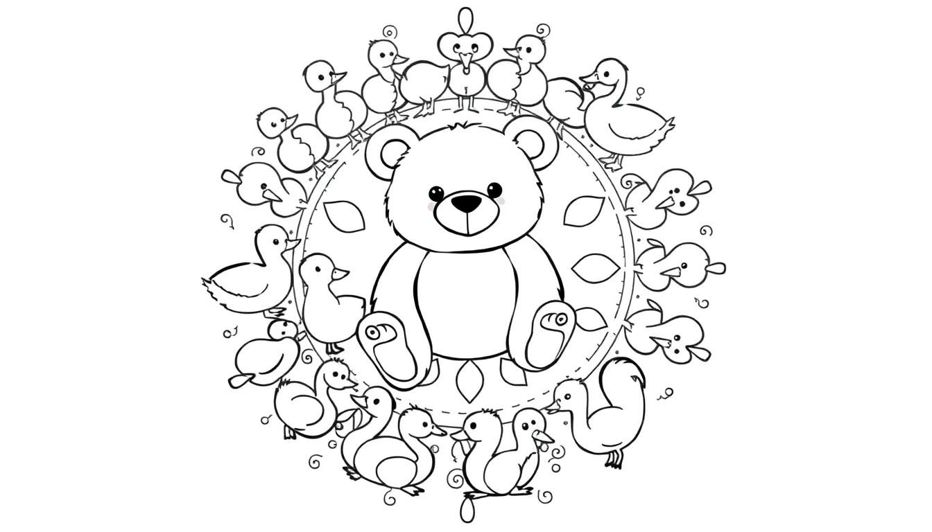 Ontdek deze schattige, gedetailleerde kleurplaat met een grote, knuffelige beer omringd door een cirkelvormige compositie van eendjes en blaadjes. Perfect voor creatief plezier!