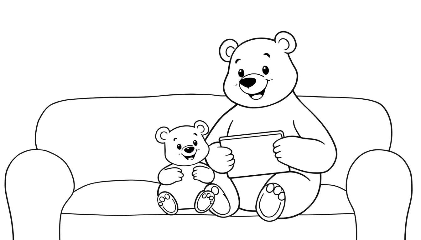 Een schattige zwart-wit lijntekening van een grote, volwassen beer en een klein beertje die samen op een bank zitten en vrolijk een boek of tablet bekijken. Perfect om in te kleuren en plezier mee te hebben!
