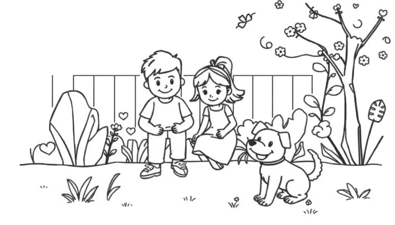 Stap in een wereld vol zonneschijn en lachende gezichten met deze betoverende zwart-wit lijntekening, perfect om tot leven te komen met jouw favoriete kleuren. In het hart van de afbeelding schitteren een jongen en een meisje, beiden stralend van geluk. De jongen, gekleed in een zomers T-shirt en korte broek, staat fier naast het meisje dat comfortabel zit in haar jurkje, met haar haar speels in een paardenstaart gebonden. Hun oprechte glimlachen nodigen uit om deel te nemen aan hun plezier. Achter dit gelukkige duo strekt zich een charmant, laag hekje uit, dat de grens vormt met een droomachtige achtergrond. Rechts van het meisje, als trouwe metgezel, zit een uitgelaten hond met een vrolijke halsband, wiens blije uitdrukking aanstekelijk werkt. De voorgrond is een explosie van groen, met weelderig gras en een verscheidenheid aan planten, waarvan sommige zijn versierd met schattige hartjes, wat een extra vleugje liefde toevoegt aan de scène. Deze kleurplaat is meer dan alleen een tekening; het is een uitnodiging tot verbeelding en creatieve expressie, ideaal voor zowel jong als oud om samen van te genieten.