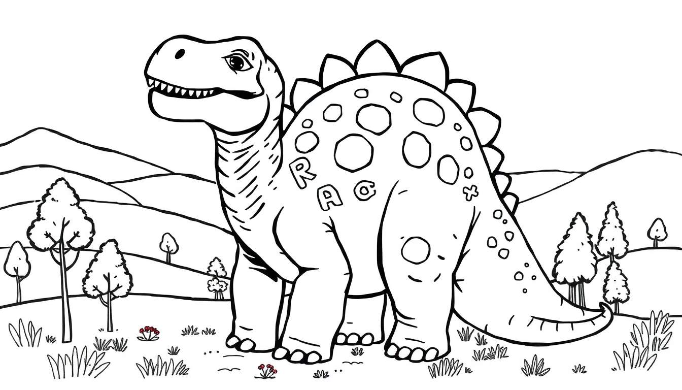 Deze zwart-wit tekening is een fantastische kleurplaat van een vriendelijke dinosaurus in een levendig landschap. Perfect voor kinderen om hun creativiteit de vrije loop te laten met kleuren. Bevat een gedetailleerde dinosaurus met vlekken, stekels en de letters ‘R A C @’ op zijn flank, omringd door heuvels, bomen en bloemen.