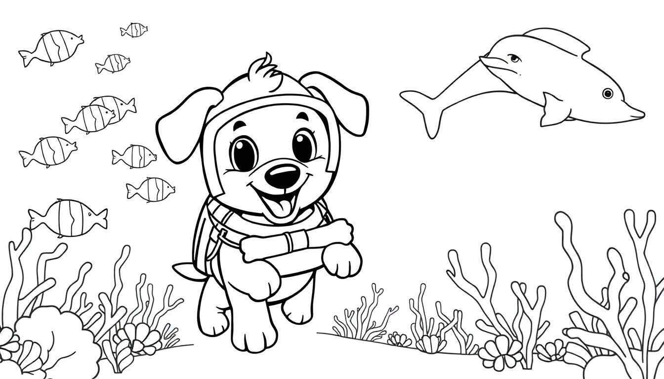 Download deze leuke kleurplaat van een vrolijke hond die de onderwaterwereld verkent! Perfect om in te kleuren voor kinderen.