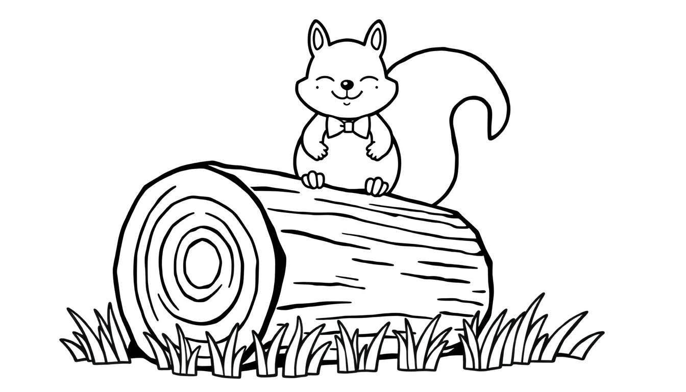 Download deze schattige kleurplaat van een lachende eekhoorn met een vlinderdasje, zittend op een boomstam omringd door gras. Perfect voor creatieve kinderactiviteiten!
