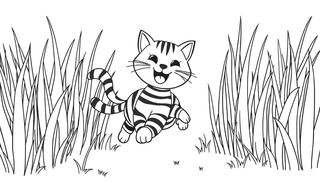 Deze charmante zwart-wit lijntekening nodigt kinderen (en volwassenen!) uit om hun creativiteit de vrije loop te laten. Centraal in het plaatje staat een vrolijke, gestreepte kat met een brede lach en een uitgestoken tong, die vol enthousiasme lijkt te springen of te rennen. De kat is omringd door weelderig, hoog gras aan beide zijden, wat de suggestie wekt dat hij zich in een avontuurlijke open ruimte bevindt. Enkele kleine grasplukjes op de voorgrond maken het tafereel compleet.