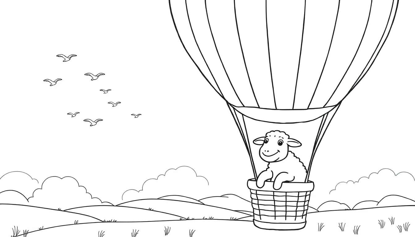 Een charmante zwart-wit kleurplaat van een grote heteluchtballon met een lachend schaap in de mand. Boven vliegen vogels en onder is een heuvelachtig landschap met gras en wolken.
