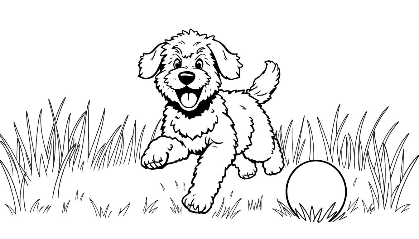 Een zwart-wit kleurplaat van een energieke en pluizige hond die blij door het gras rent, met een bal rechtsonder. Perfect om in te kleuren!
