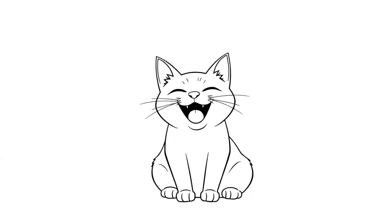 Gratis zwart-witte lijntekening van een uitbundig lachende kat. Perfect om in te kleuren! Deze vrolijke kat met gespleten ogen, open mond en zichtbare tong en hoektanden is klaar om jouw creativiteit te ontdekken. Eenvoudige stijl voor urenlang kleurplezier.