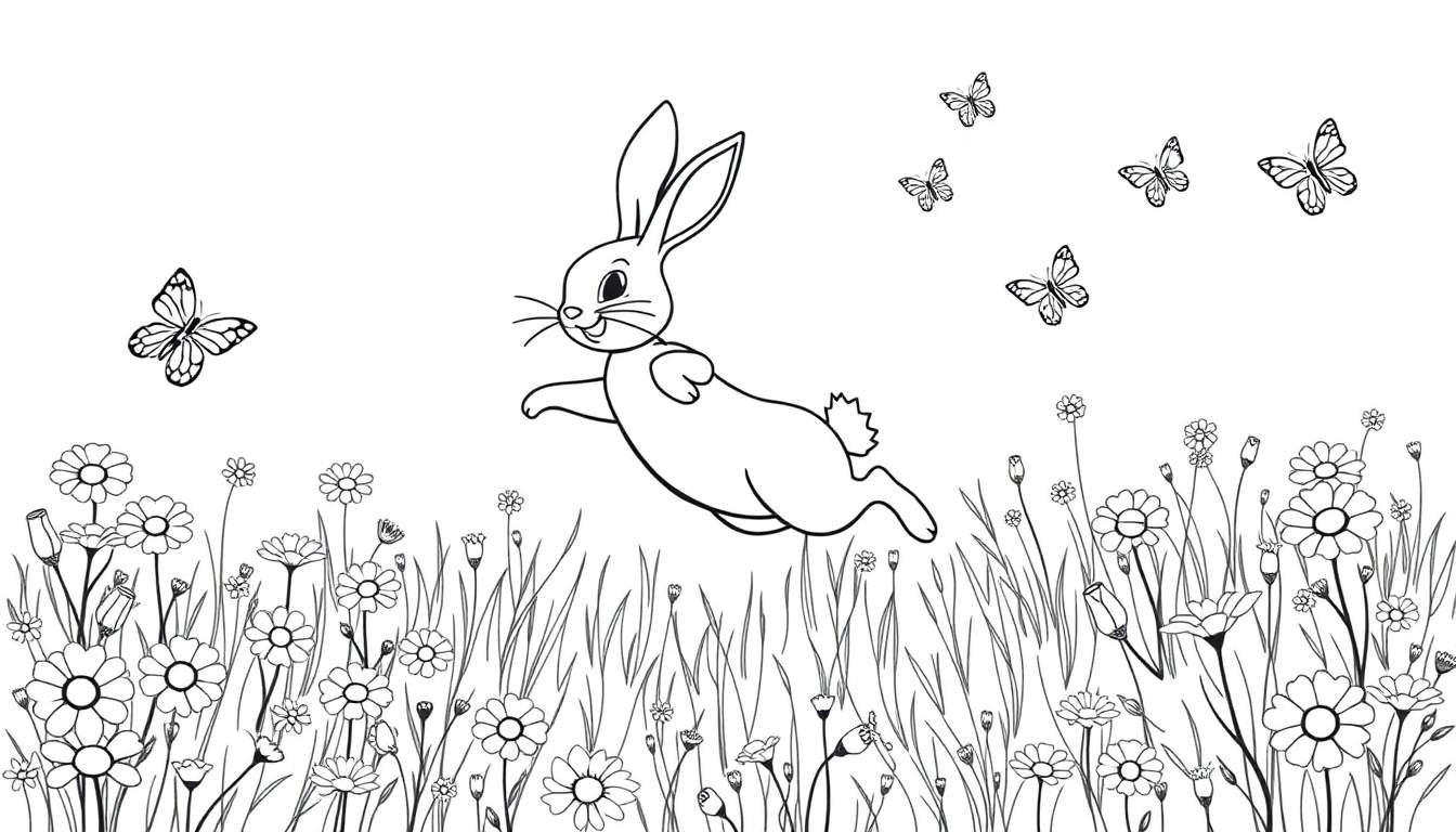 Gratis kleurplaat van een springend konijn omringd door kleurrijke bloemen en fladderende vlinders. Perfect voor kinderen om de lente te vieren en hun creativiteit te uiten met levendige kleuren.