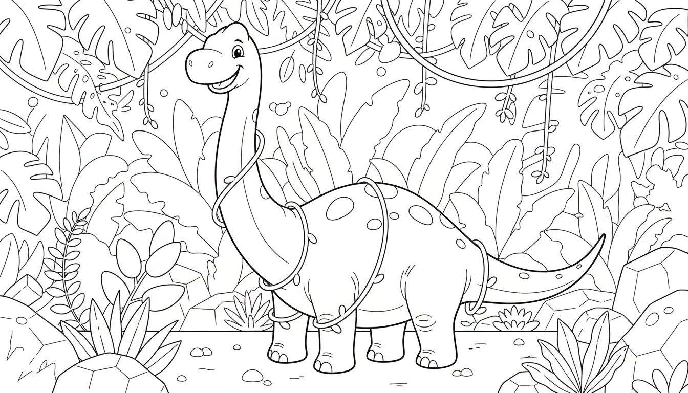 Stap terug in de tijd en beleef een avontuurlijke reis naar de prehistorie met deze fantastische kleurplaat! In het hart van een weelderige, tropische jungle staat een grote, vriendelijke langnekdinosaurus (ook wel bekend als een sauropode) met een brede glimlach. Zijn lange nek reikt speels omhoog, terwijl lianen als natuurlijke slingers om zijn lichaam en nek gewikkeld zijn. De omgeving is rijk aan leven met gigantische, tropische bladeren, sierlijke varens en andere weelderige planten die de jungle compleet maken. Overal zie je hangende lianen die uitnodigen tot fantasievolle spelletjes en op de grond liggen diverse stenen en kleinere plantjes die het tafereel nog levendiger maken.
