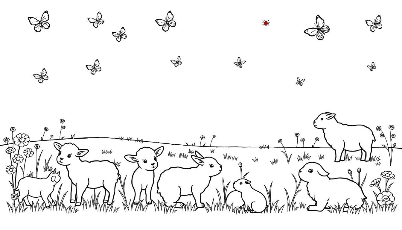 Wist je dat lammetjes, zodra ze geboren zijn, al binnen enkele uren kunnen staan en lopen? Dit stelt hen in staat om snel de kudde te volgen en gevaar te ontwijken. Konijnen staan bekend om hun snelle voortplanting, wat hen tot een symbool van vruchtbaarheid maakt. En die vlinders in de lucht? Elke vlindersoort heeft unieke patronen en kleuren op hun vleugels, die ze gebruiken voor camouflage, om soortgenoten te herkennen en om indruk te maken op potentiële partners. Stel je voor dat je de lammetjes een zachte, wollige vacht geeft, de konijntjes een natuurlijke bruine of grijze kleur, en de bloemen alle kleuren van de regenboog. Laat de vlinders schitteren in felle, contrasterende tinten en geef het lieveheersbeestje die kenmerkende rode kleur met zwarte stippen. Dit plaatje is niet zomaar een kleurplaat, het is een verhaal dat jij gaat vertellen met je penseel of potlood!