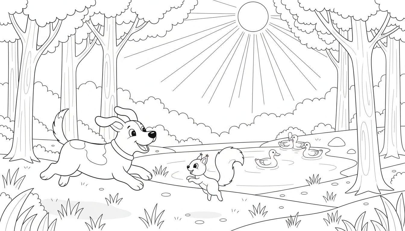Een levendige zwart-wit kleurplaat vol natuur en spelende dieren. Perfect om in te kleuren! Zie een rennende hond, een dartelende eekhoorn, zwemmende eenden, hoge bomen en een stralende zon.