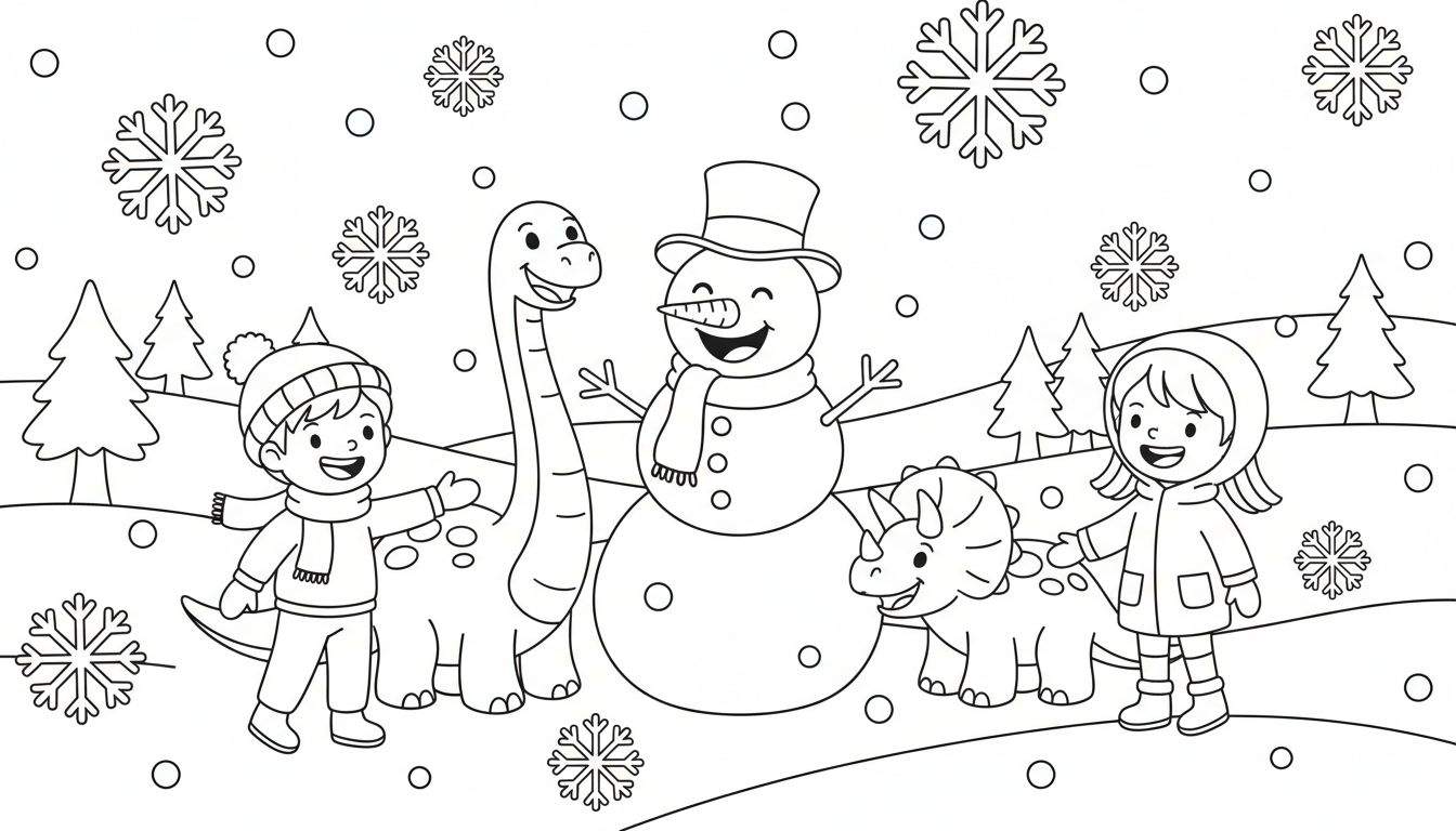 Download deze gratis kleurplaat van een gezellige winterdag! Kinderen spelen in de sneeuw met twee vriendelijke dinosaurussen, een vrolijke sneeuwpop en besneeuwde dennenbomen op de achtergrond. Perfect voor eindeloos kleurplezier!