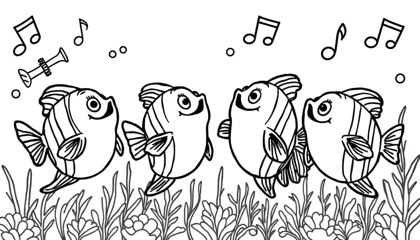 Een vrolijke zwart-wit kleurplaat met vier zingende vissen, omringd door muzieknoten, luchtbellen, een trompet en levendige waterplanten. Perfect voor creatief kleurplezier!