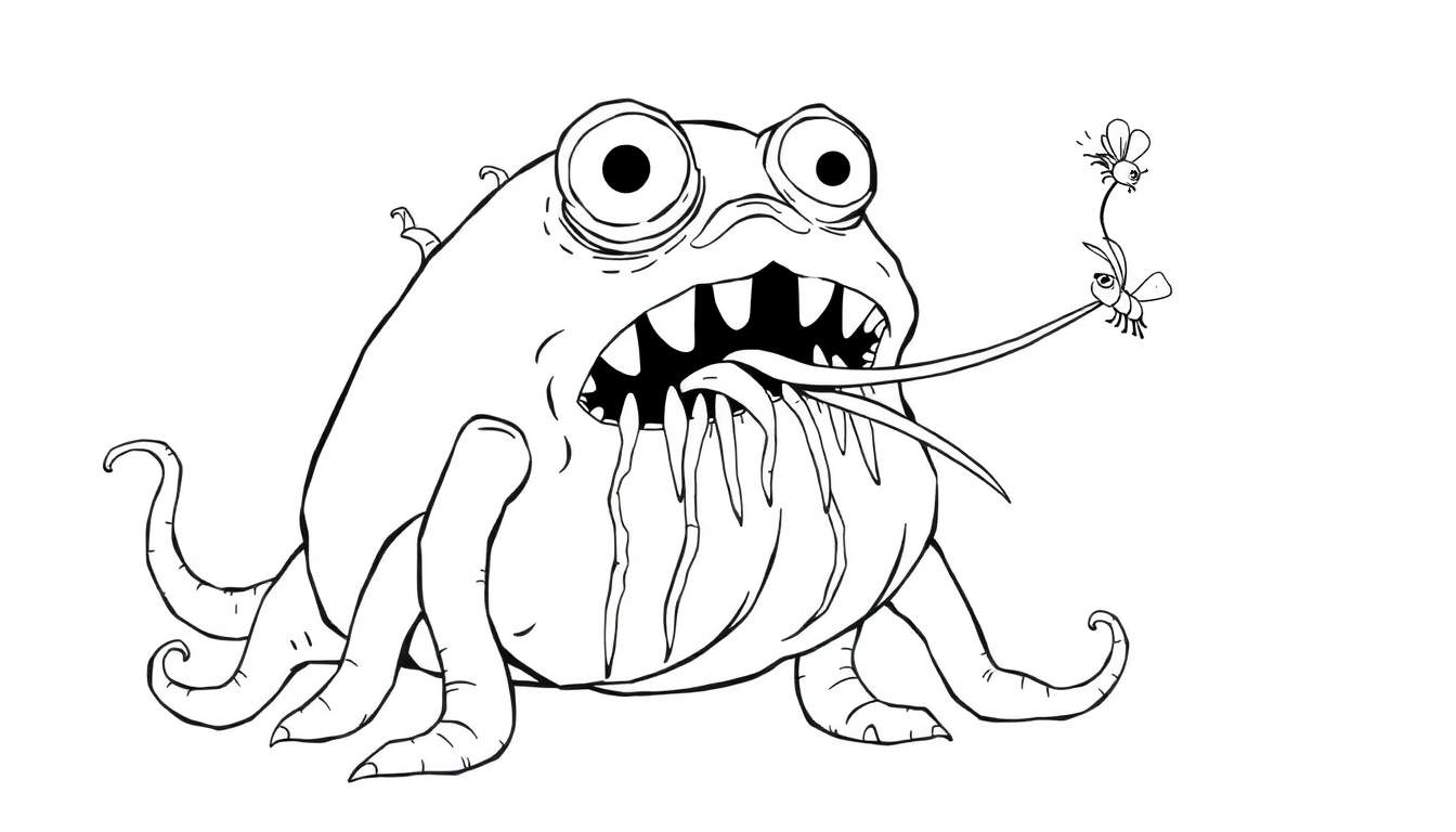 Een leuke en spannende zwart-wit kleurplaat van een cartoonachtig monster dat met zijn lange tong probeert insecten te vangen. Perfect voor creatieve kinderen!
