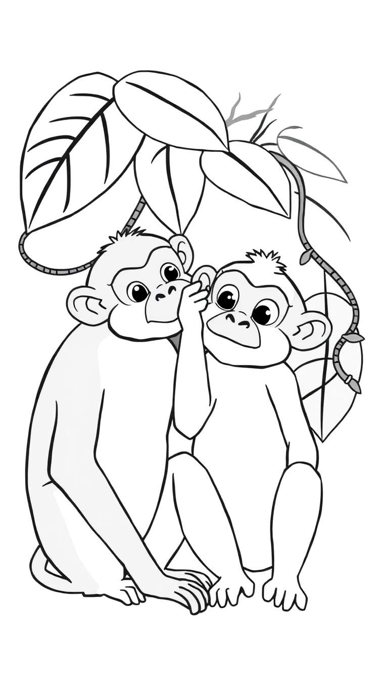 Een schattige zwart-wit kleurplaat van twee vriendelijke apen die samen op de grond zitten. De aap links fluistert een geheim in het oor van de aap rechts, met zijn hand bij diens oor. Grote bladeren en lianen boven hen suggereren een jungle omgeving. Deze tekening nodigt uit tot creativiteit en brengt een vrolijke, interactieve sfeer.