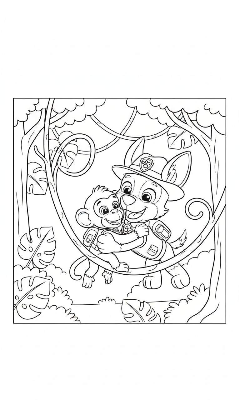 Ontdek deze schattige zwart-wit lijntekening, perfect als kleurplaat. Het tafereel toont een hartverwarmende knuffel tussen een stoere hond met safarihoed en pootafdruk-embleem, en een kleinere aap met rugzakje. Ze zijn omringd door een weelderige jungle met lianen, bomen en tropische bladeren, wat een sfeer van vriendschap en avontuur oproept. Ideaal voor uren kleurplezier!