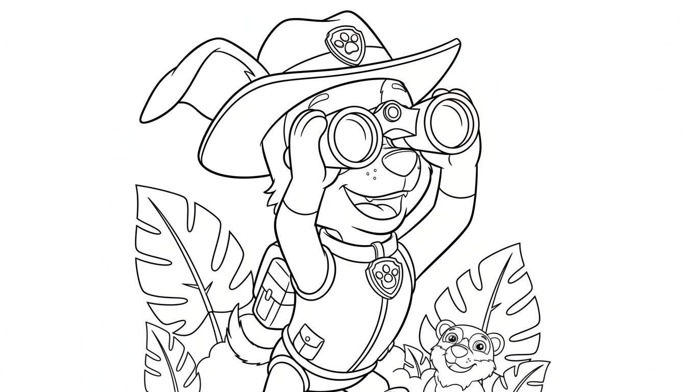 Een spannende kleurplaat van Tracker, de chihuahua uit Paw Patrol, gekleed als een dappere avonturier. Hij draagt een stoere safarihoed met het Paw Patrol-embleem en houdt een verrekijker voor zijn ogen, terwijl hij met een brede glimlach nieuwsgierig de verte in tuurt. Zijn avontuurlijke uitrusting bestaat uit een uniform of vest met handige zakken en een stevige rugzak. Om hem heen suggereren grote tropische bladeren een weelderige jungle of bosrijke omgeving. Rechtsonder tussen de bladeren verschijnt een vrolijk, aap-achtig diertje, mogelijk een maki of lemur, dat met een lach meedoet aan de ontdekkingstocht. Deze lijntekening nodigt uit tot een kleurrijk avontuur.