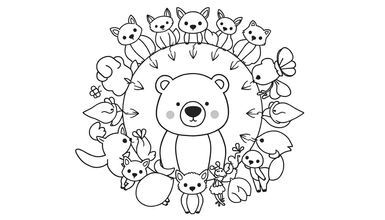 Duik in de wondere wereld van de natuur met deze betoverende kleurplaat! Centraal staat een grote, vrolijke beer met een hartverwarmend gezicht, die als een warme knuffel het middelpunt vormt van een schattige bijeenkomst. Om hem heen scharen zich allerlei kleine bosdiertjes: vosjes met spitse oren, pluizige konijntjes, ijverige eekhoorns en vrolijk fluitende vogeltjes. Zelfs een sierlijke vlinder fladdert tussen de ranken en bladeren door. Elk detail, van de zwarte neus van de beer tot de puntige oortjes van de vosjes, is met liefde getekend om jouw creativiteit te prikkelen.