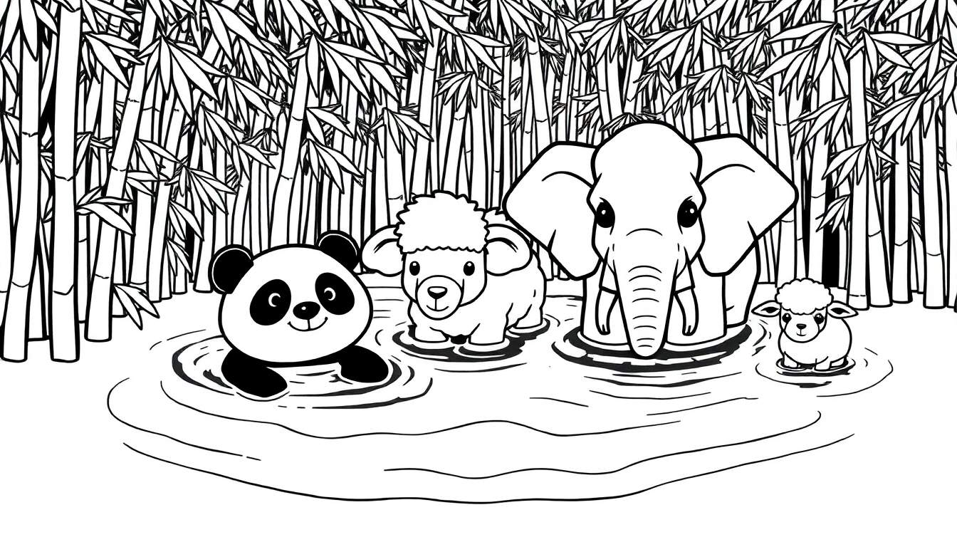De achtergrond van deze kleurplaat is een dichtbegroeid bamboebos, waar de karakteristieke, dunne stengels en weelderige bladeren de ruimte vullen. Op de voorgrond nodigt het zachtjes rimpelende water de dieren uit om te verkoelen en te spelen. Helemaal links vinden we een charmante panda, herkenbaar aan zijn zwarte oren en oogvlekken, die met een glimlach naar voren kijkt. Naast hem staat een lief, wollig lammetje, gevolgd door een indrukwekkende olifant die met zijn slurf deels in het water reikt. Tenslotte staat aan de rechterkant nog een kleiner, eveneens schattig lammetje. Samen vormen ze een harmonieus gezelschap, klaar om de fantasie van de kleurder te ontketenen. Wist je dat panda’s bijna hun hele leven besteden aan het eten van bamboe? En olifanten gebruiken hun slurf als een ongelooflijk veelzijdige tool, van ademen tot drinken en zelfs het oppakken van kleine objecten!