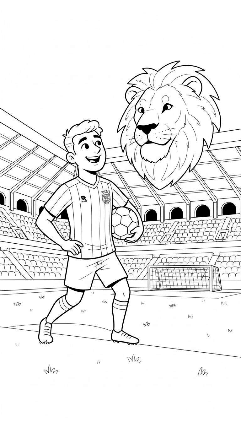 Ontdek deze unieke Willem II kleurplaat! Een vrolijke jonge voetballer, gekleed in een gestreept Willem II shirt met clublogo (kroon en leeuw), poseert trots met een voetbal in een sfeervol voetbalstadion. Boven hem prijkt een majestueuze leeuwenkop, symbool van kracht en clubtrots. Ideaal voor jonge fans om in te kleuren en hun liefde voor Willem II te uiten. Perfect voor kinderen die van voetbal houden en de sfeer van het stadion willen beleven.
