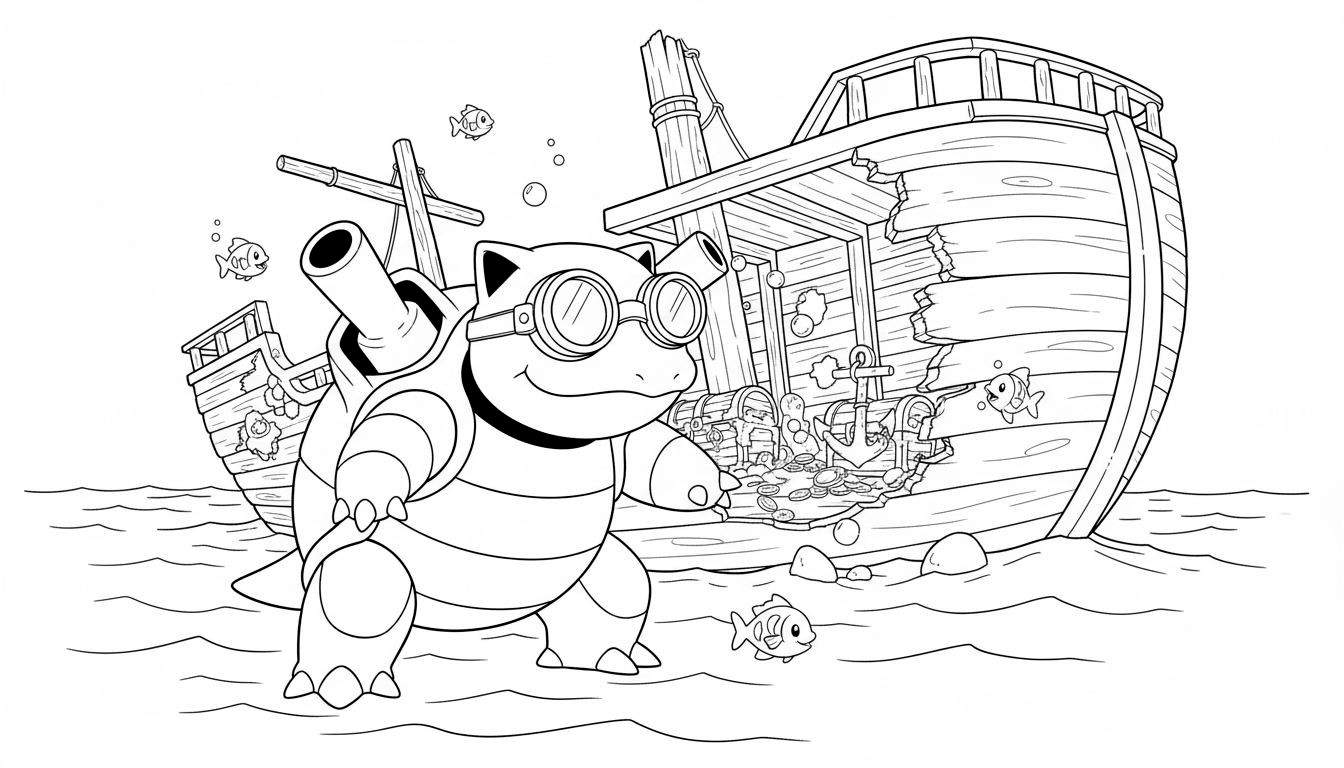 Deze gedetailleerde tekening toont Blastoise bij een imposant, gehavend scheepswrak, waar de tijd zijn sporen heeft achtergelaten met gebroken rompen en een gebroken mast. Rondom het wrak liggen verborgen schatkisten die openbarsten en hun rijkdommen – glimmende gouden munten en kostbare juwelen – onthullen. Een anker en losse stenen liggen op de bodem, terwijl kleine visjes vrolijk rondzwemmen en overal luchtbellen opstijgen, wat de levendige onderwaterwereld compleet maakt.