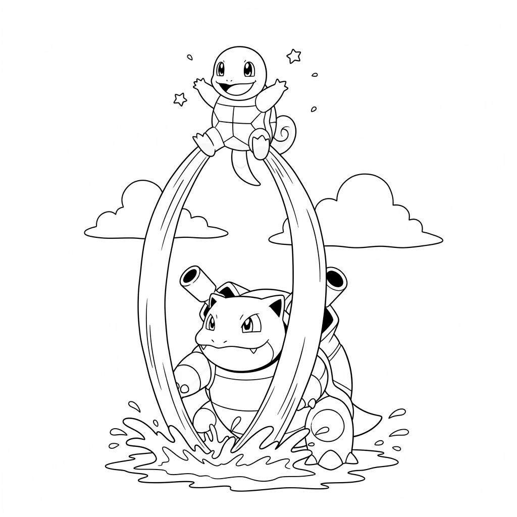 Wist je dat Blastoise de laatste evolutie is van Squirtle? Squirtle evolueert naar Wartortle en dan uiteindelijk naar de machtige Blastoise! Deze kleurplaat toont ze samen, alsof Blastoise zijn jongere zelf (of een vriend!) leert vliegen met zijn indrukwekkende waterkracht. Een perfecte gelegenheid om na te denken over hun evolutiereeks en de kracht van water-Pokémon terwijl je creatief bezig bent.