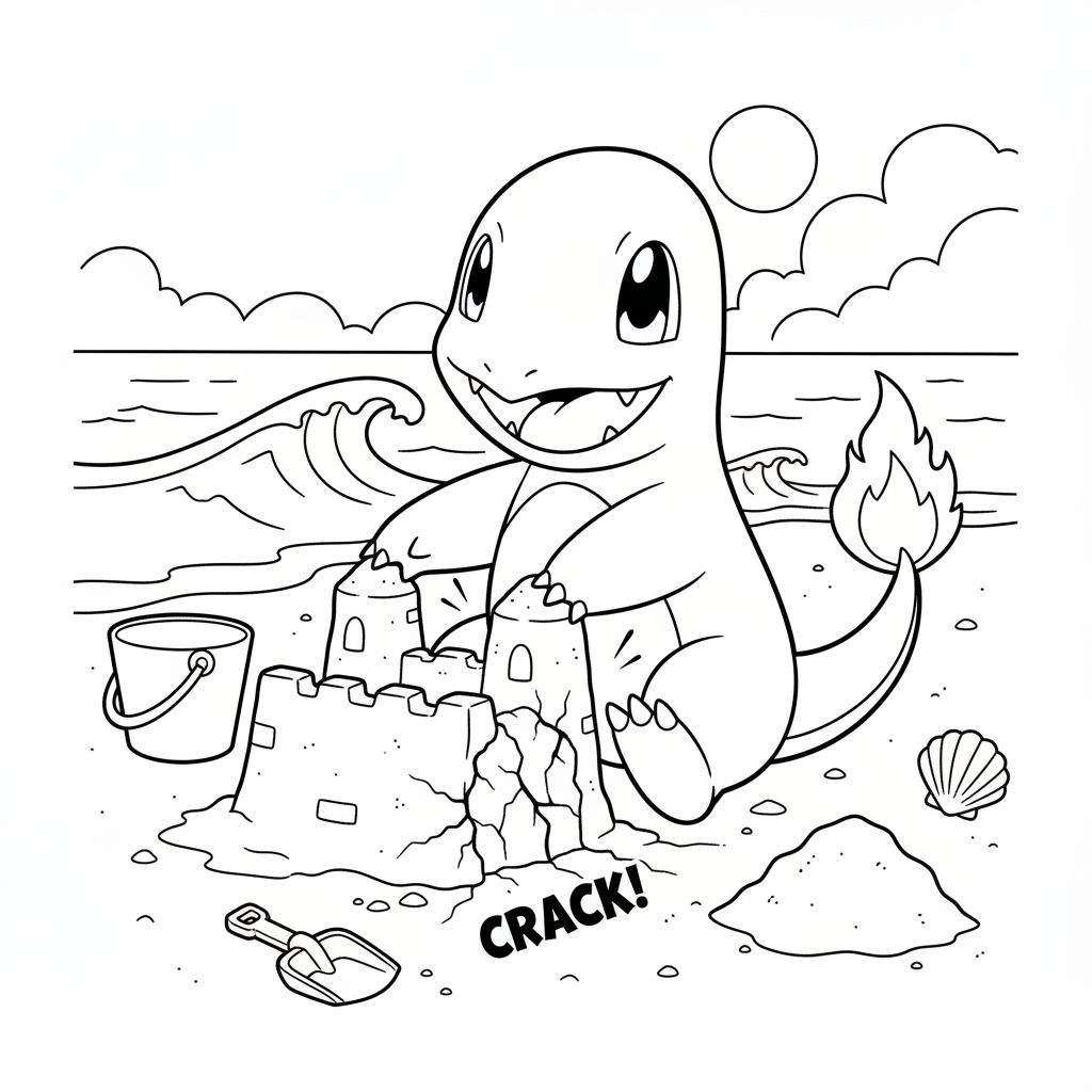 Stel je voor: een zonnige dag aan zee, het zand warm onder je voeten, en daar is Charmander, één van de meest geliefde Pokémon! Deze unieke kleurplaat vangt precies dat moment. Je ziet Charmander stralend van plezier, volledig geconcentreerd op zijn meesterwerk: een indrukwekkend zandkasteel. Met zijn kenmerkende vlam op zijn staart, voelt hij zich duidelijk in zijn element. Maar wat is dat? Aan de basis van zijn bouwwerk staat het woord “CRACK!”, wat een hilarische hint geeft dat zelfs de meest zorgvuldig gebouwde zandkastelen niet eeuwig duren. Het is een grappige knipoog die zowel kinderen als volwassenen zal laten glimlachen.