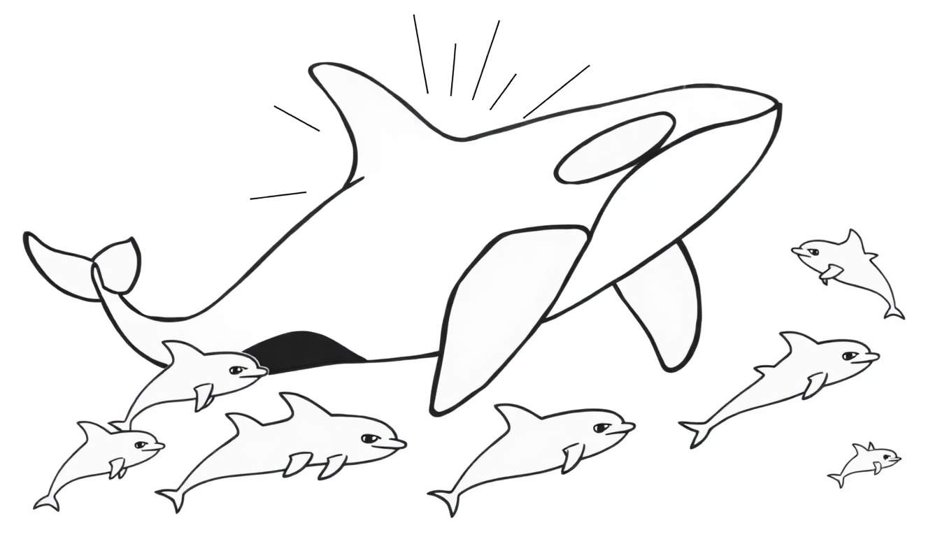 Een vrolijke kleurplaat met een grote orka omringd door een groep van zeven dolfijnen. Perfect voor kinderen om in te kleuren en te leren over deze fascinerende zeezoogdieren.