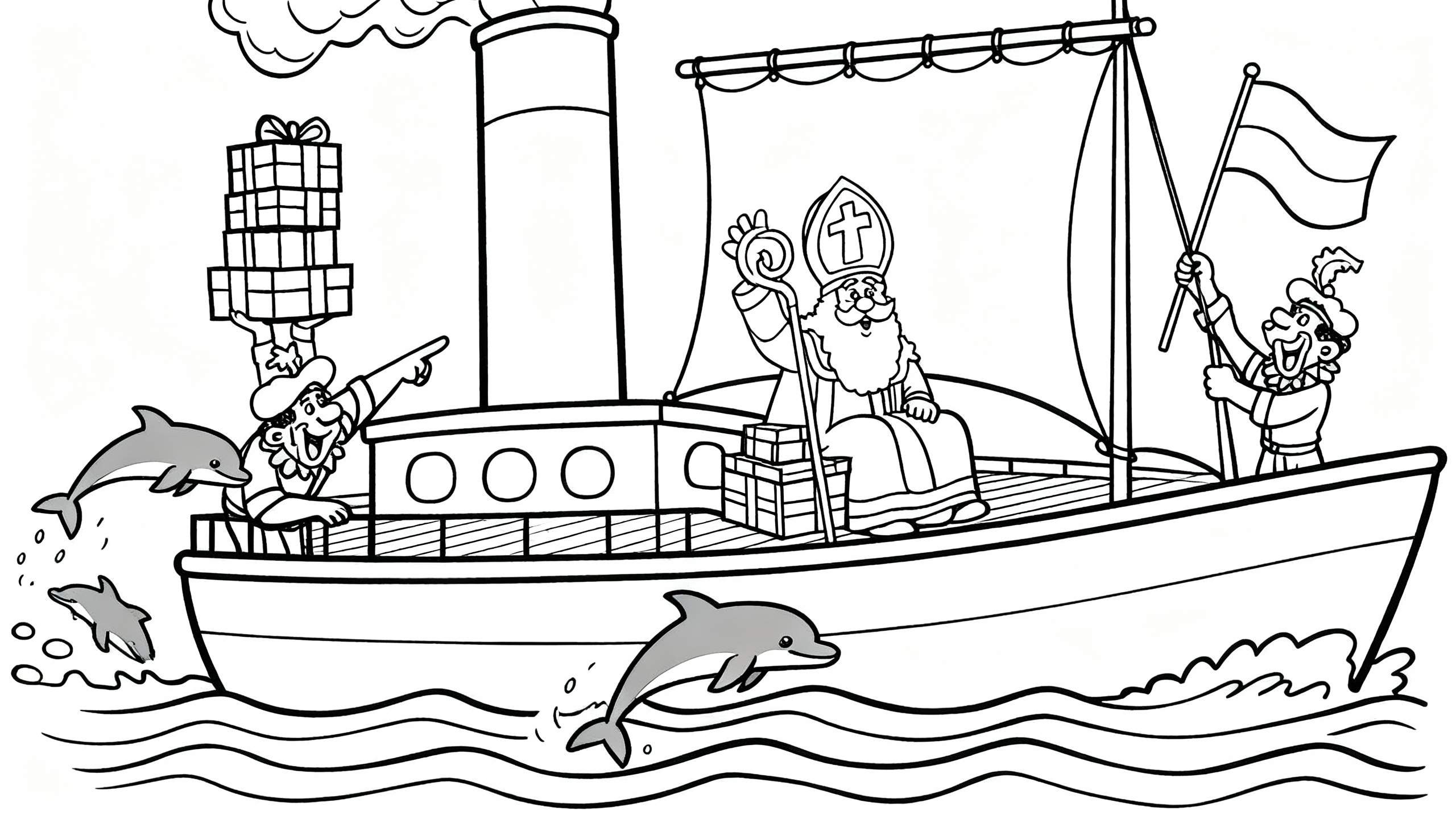 Duik in de Sinterklaasviering met deze vrolijke kleurplaat! Sinterklaas arriveert per grote stoomboot, omringd door zijn trouwe Pieten met cadeaus en een vlag. Springende dolfijnen maken de feestelijke scène compleet. Een gedetailleerde zwart-wit tekening voor urenlang kleurplezier, perfect voor de Sinterklaastijd.