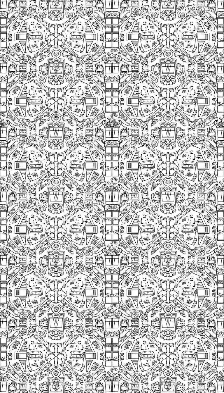 Duik in de uitdagende wereld van deze Sinterklaas kleurplaat, speciaal ontworpen voor gevorderde kleurliefhebbers. De gedetailleerde zwart-wit tekening toont een prachtig herhalend en symmetrisch patroon, boordevol feestelijke en winterse taferelen. Ontdek talloze ingepakte cadeautjes en geschenken met elegante strikken, afgewisseld met schattige pinguïns, sommigen getooid met mutsjes of warme sjaals. Centraal in de secties zie je decoratieve raamkozijnen of panelen, vaak versierd met een strik, terwijl kerstachtig loofwerk en bladmotieven de randen sieren. Overal zijn vrolijke muzieknoten en fonkelende sterretjes verspreid, wat bijdraagt aan de magische sfeer. Zelfs objecten die lijken op kerstsokken of sierlijke vaasjes met decoraties zijn te vinden. Het geheel ademt een warme, winterse en feestelijke stemming uit, ideaal voor urenlang ontspannend en creatief kleurplezier tijdens de Sinterklaasperiode.