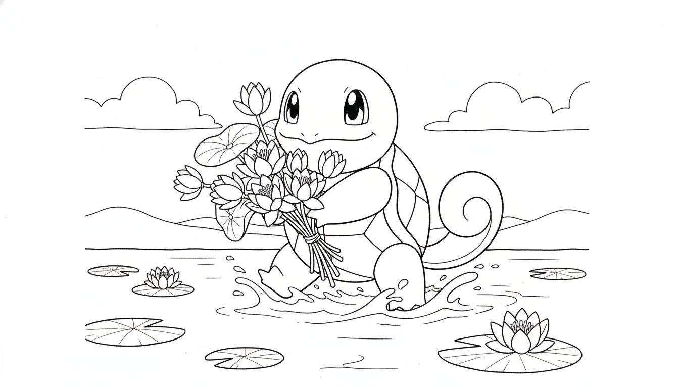 Een gedetailleerde zwart-wit lijntekening, ideaal als kleurplaat, met in het midden de populaire Pokémon Squirtle. Deze schildpad-achtige Pokémon staat glimlachend in het water, waar rond zijn voeten lichte waterspetters te zien zijn. Hij houdt een prachtig, groot boeket waterlelies of lotusbloemen vast. Op het wateroppervlak drijven diverse waterleliebladeren en bloeiende waterlelies/lotusbloemen. De achtergrond toont een sereen, glooiend landschap met heuvels of bergen onder een bewolkte hemel, wat de rustige en vrolijke sfeer van de scène accentueert. Perfect voor liefhebbers van Pokémon en kleuren.