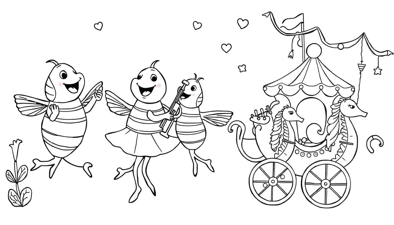 Stel je voor dat deze bijtjes de koninklijke muzikanten zijn van het Zeepaardjes Rijk. Ze reizen rond om feesten op te vrolijken met hun muziek en dans, en dit rijtuig is hun speciale vervoermiddel dat glinstert als de mooiste schelp onder de zee. Misschien zijn de hartjes boven hen wel de wensen die ze verzamelen van alle kinderen die de kleurplaat inkleuren, en de sterren geven ze kracht om de mooiste muziek te maken. Wat zou jij de bijtjes en zeepaardjes voor muziekinstrumenten geven, of welke kleuren zouden ze dragen op deze speciale dag?