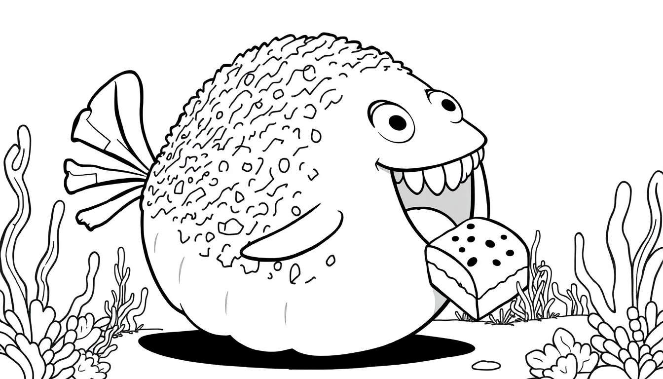Download deze leuke zwart-wit kleurplaat van een grappige, ronde vis met een lachende mond die een heerlijk stuk taart of brownie eet. Omringd door kleurrijke zeewier en koraal, is deze onderwaterscène perfect voor urenlang kleurplezier voor jong en oud. Stimuleer de creativiteit met dit cartoonachtige aquatische tafereel.