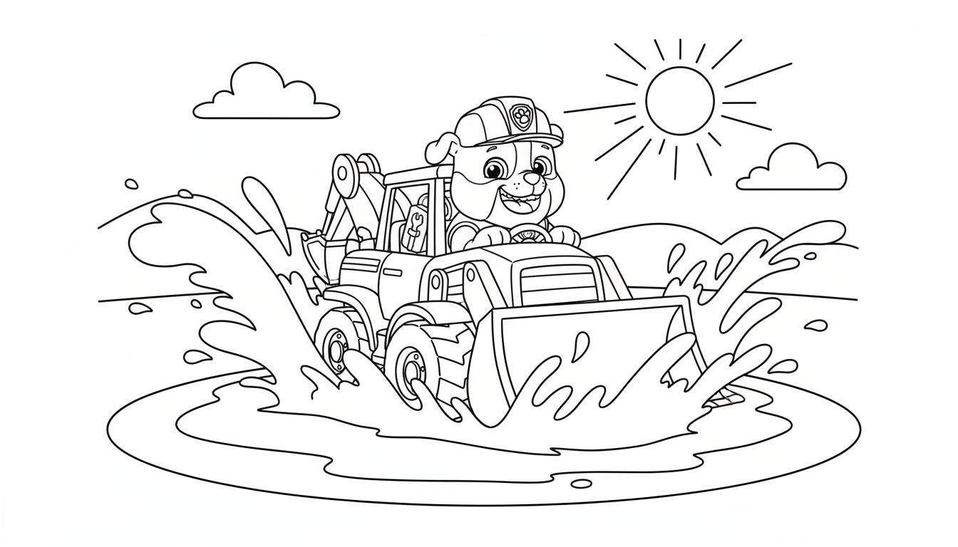 Ontdek deze dynamische Rubble Paw Patrol kleurplaat waarop het vrolijke bouwhondje Rubble achter het stuur van zijn grote graafmachine door het water scheurt. Overal spat het water vrolijk omhoog, wat zorgt voor een levendige scène vol actie. Met een bouwhelm op en een brede glimlach op zijn gezicht, is Rubble klaar voor elk avontuur. Op de achtergrond schijnt een vrolijke zon en zijn er glooiende heuvels te zien. Perfect voor kinderen die fan zijn van Paw Patrol en van actievolle kleurplaten houden! Ideaal voor urenlang kleurplezier.