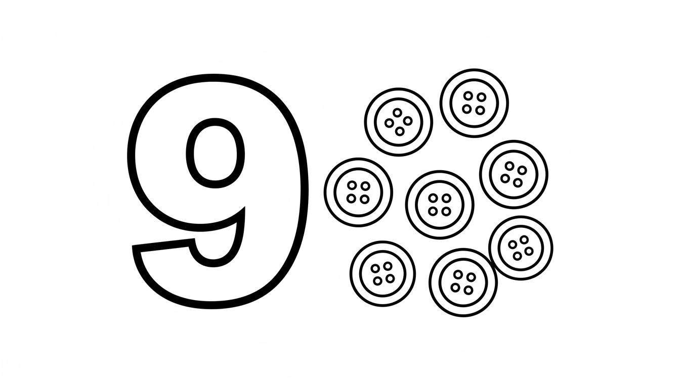 Een zwart-wit lijntekening, ideaal als kleurplaat voor jonge kinderen. Centraal staat aan de linkerkant een prominent en groot cijfer 9. Aan de rechterkant van de afbeelding zijn negen individuele knopen willekeurig over het vlak verspreid. Elke knoop is gedetailleerd weergegeven met vier gaatjes, geplaatst in een perfect vierkant patroon. Deze eenvoudige en duidelijke illustratie is ontworpen om kinderen te helpen het cijfer 9 te herkennen en het concept van ‘negen’ te begrijpen door middel van tellen.