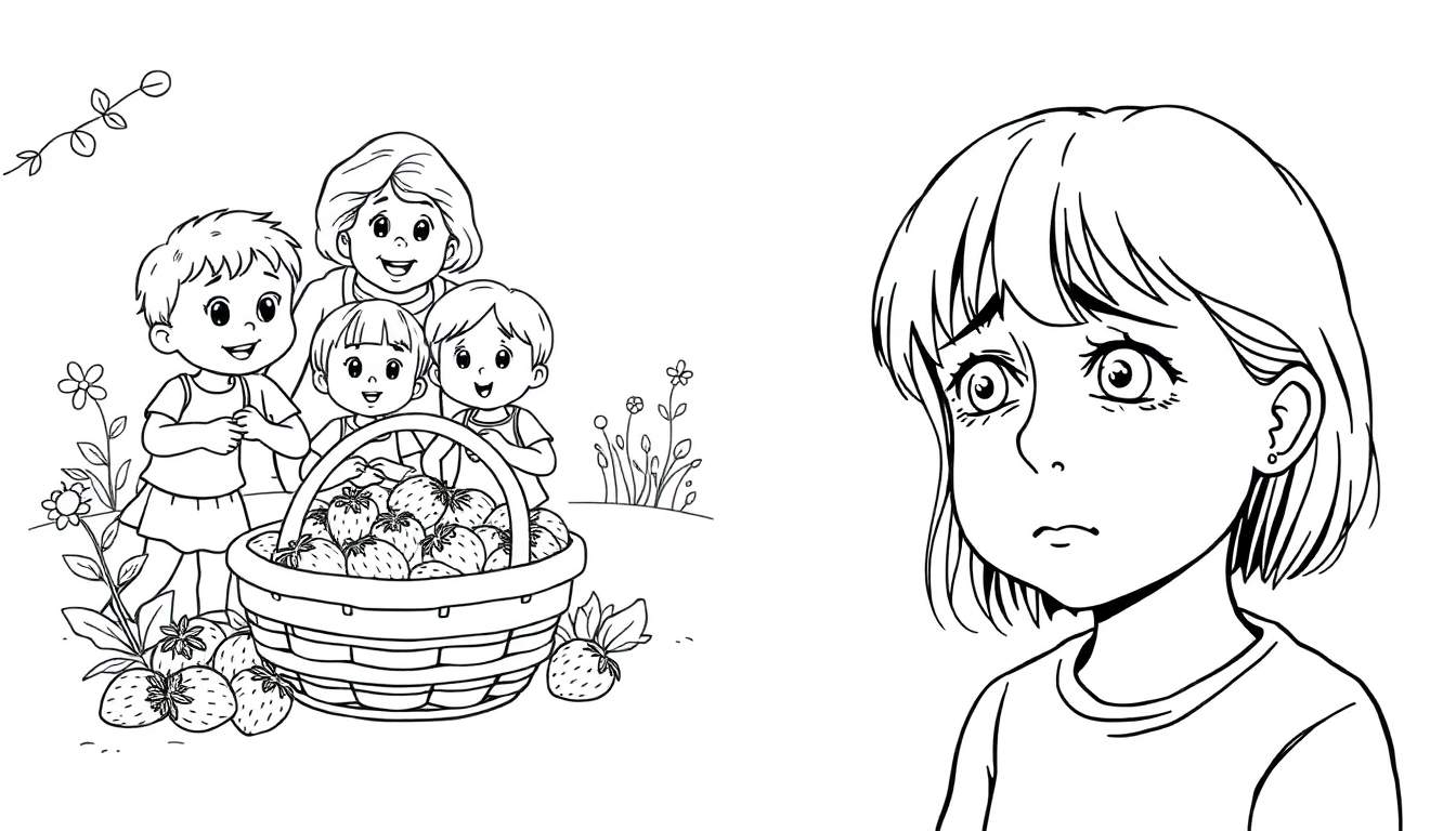 Een dubbele kleurplaat met aan de linkerkant een blije familie met aardbeien en aan de rechterkant een angstig meisje. Ideaal voor creatieve expressie en het verkennen van emoties.