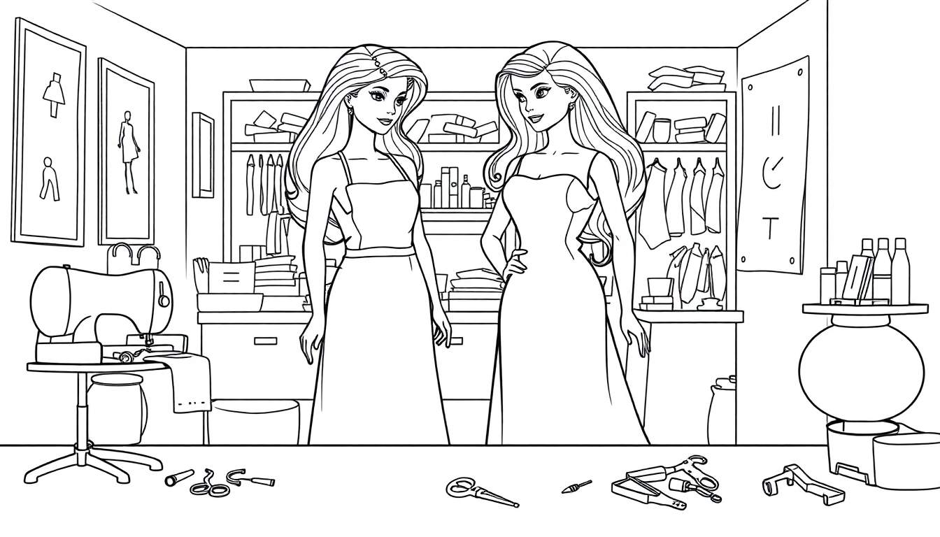 Een gedetailleerde zwart-wit kleurplaat van een modieuze studio of kleermakerij. Centraal staan twee elegante poppen, omringd door materialen, schetsen en gereedschappen die nodig zijn voor het ontwerpen en creëren van kleding. Perfect voor creatieve kinderen en volwassenen.