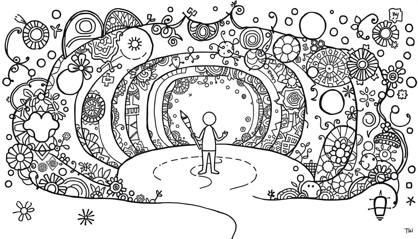Een gedetailleerde zwart-wit lijntekening die een simpel poppetje met een grote kwast toont, staand op een podium. Achter het poppetje bevindt zich een rijkelijk versierde, boogvormige tunnel met diverse patronen. De tekening straalt creativiteit en fantasie uit.
