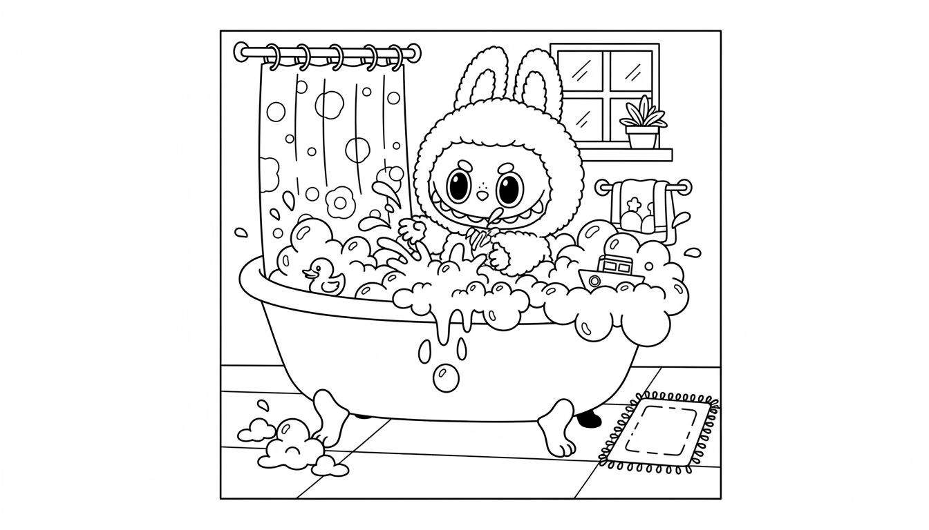 Labubu Kleurplaat: Vrolijk Konijntje in Bubbelbad | Badkamer Plezier met Badeendje
