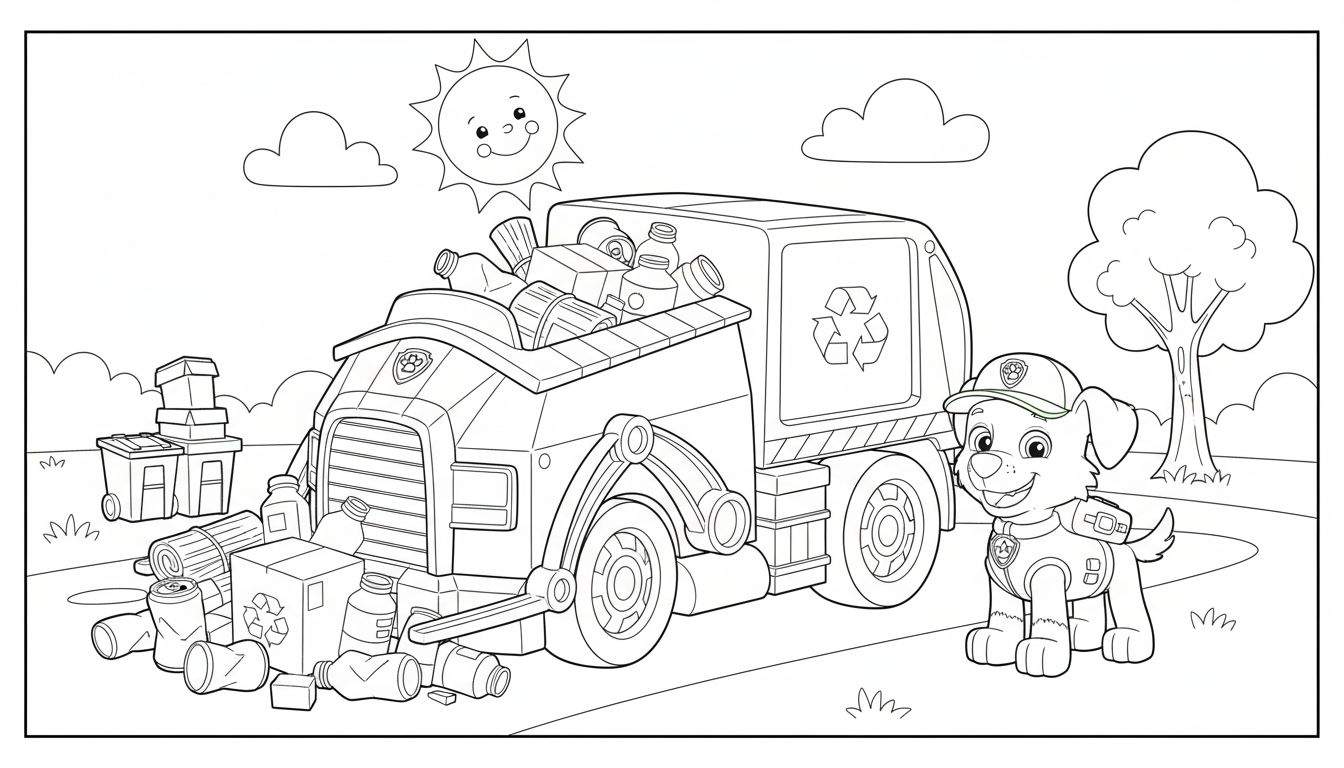 Een vrolijke kleurplaat met Rocky van Paw Patrol die kinderen op een leuke manier introduceert in de wereld van recyclen en afvalverwerking. Centraal staat een grote recyclingwagen met het recycling-symbool, gevuld met plastic flessen, blikjes en kartonnen dozen. Rocky staat lachend naast de wagen in zijn kenmerkende groene outfit. Op de grond liggen nog meer recyclebare materialen verspreid. De achtergrond toont afvalbakken, een kale boom en een vriendelijke, lachende zon tussen de wolken, wat een positieve sfeer creëert rond het thema duurzaamheid.