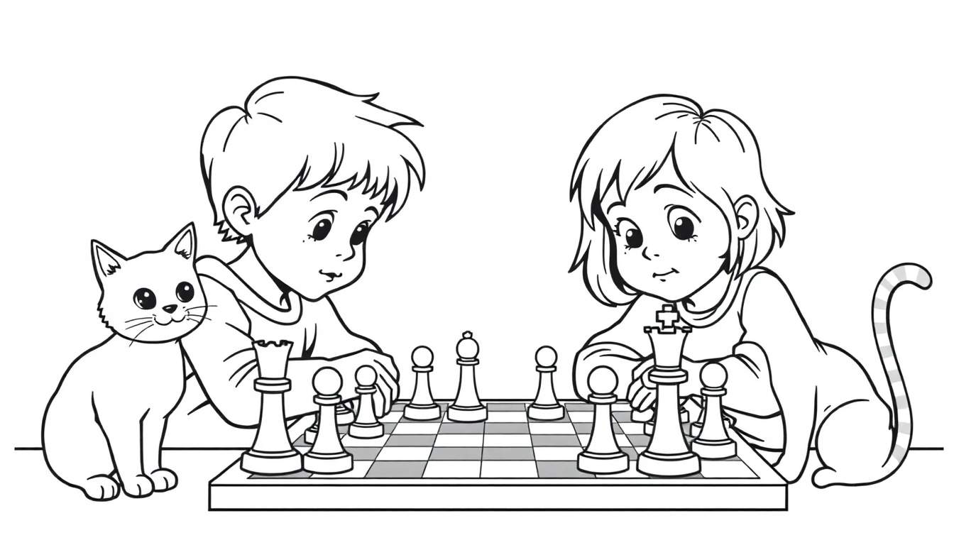 Download deze leuke zwart-wit kleurplaat van een jongen en een meisje die geconcentreerd schaak spelen, vergezeld door twee nieuwsgierige katten. Perfect voor urenlang kleurplezier!