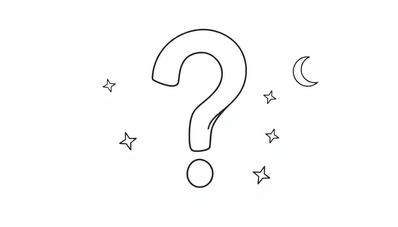Download deze leuke, minimalistische zwart-witte kleurplaat met een groot vraagteken, vijf zwevende sterren en een halve maan. Perfect voor creatieve kinderen en volwassenen die van eenvoudige, handgetekende ontwerpen houden.