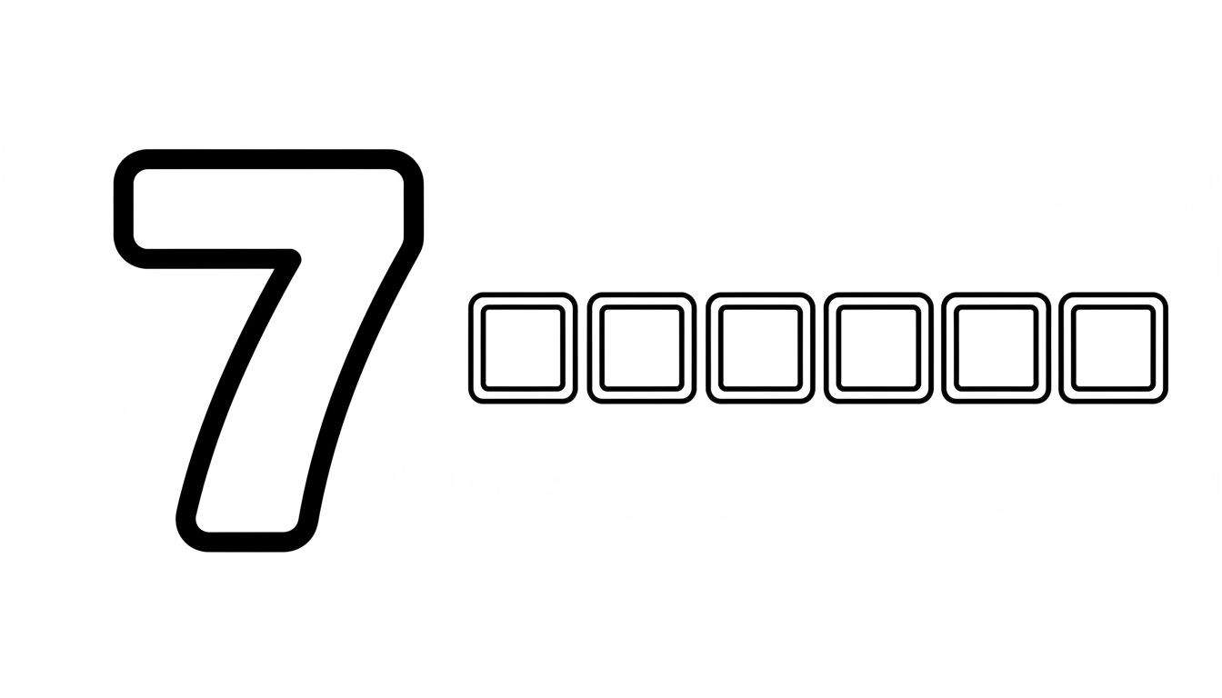 Een eenvoudige kleurplaat voor kinderen met een groot cijfer 7 en zes lege, vierkante vakjes ernaast, ideaal om te oefenen met tellen en kleuren.