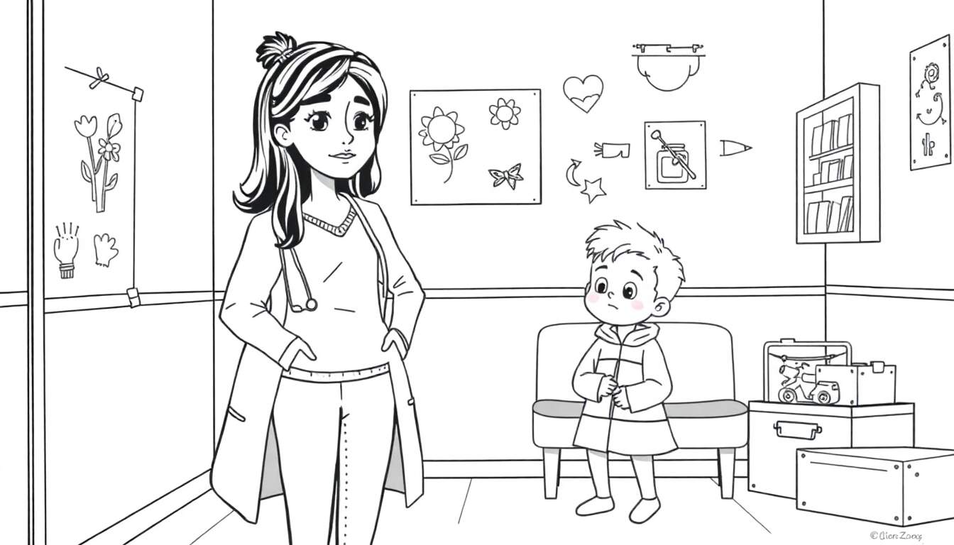 Een zwart-wit kleurplaat die een kindvriendelijke dokterspraktijk uitbeeldt. Een vriendelijke dokter met stethoscoop staat naast een enigszins bedrukt jongetje op een stoel. De muren zijn versierd met tekeningen van bloemen, dieren en symbolen. Er is een speelgoedkist en boekenplank zichtbaar.