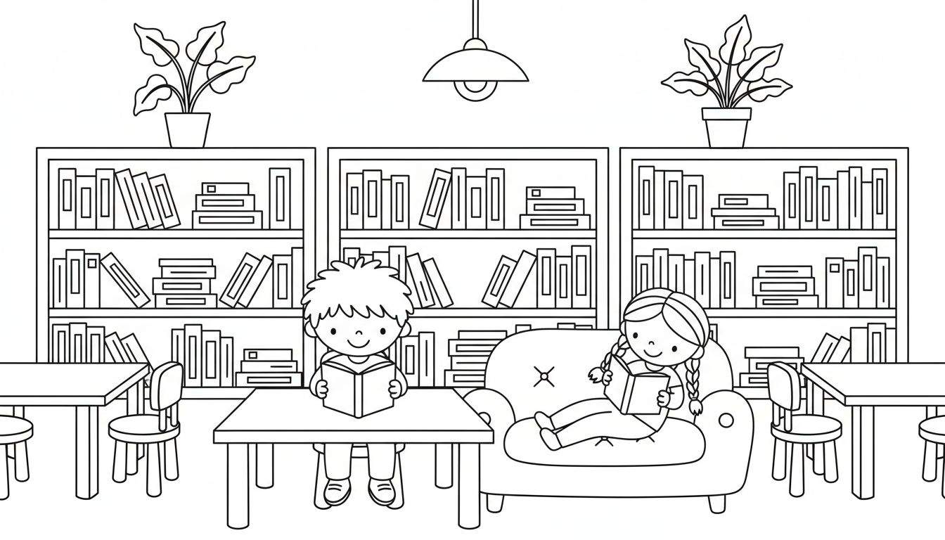 Een vrolijke zwart-wit kleurplaat van een bibliotheekhoek waar twee kinderen, een jongetje en een meisje, genieten van het lezen van boeken. De ruimte is gevuld met boekenkasten, planten en een warme sfeer.