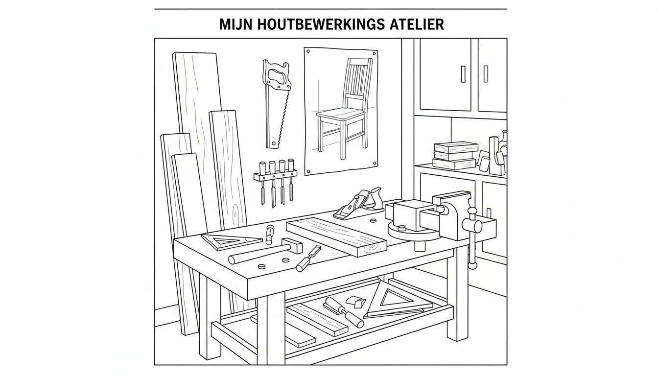 Een zwart-wit lijntekening kleurplaat van een sfeervol houtbewerkingsatelier. De focus ligt op een robuuste werkbank, compleet met bankschroef, hout en diverse handgereedschappen zoals een schaaf, winkelhaak, beitel en hamer. Gereedschappen hangen aan de muur, waaronder een grote zaag en beitels, naast een blauwdruk van een stoel. Rechts een opbergkast met boeken en potjes.