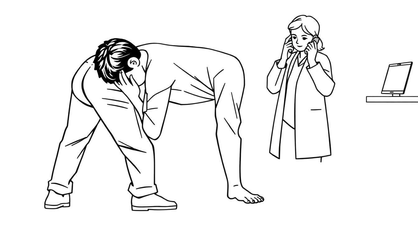 Aan de andere kant staat een vrouw, mogelijk een dokter of hulpverlener, gehuld in een witte jas. Haar glimlach is gespannen terwijl ze twee telefoons tegelijkertijd bedient. Dit beeld van intensief multitasken spreekt boekdelen over de constante bereikbaarheid en de druk om meerdere ballen tegelijk in de lucht te houden in onze hypergeconnecteerde wereld. De computermonitor op de achtergrond, op een plank geplaatst, herinnert ons aan de centrale rol van technologie in zowel ons werk als de mogelijke bron van onze stress.
