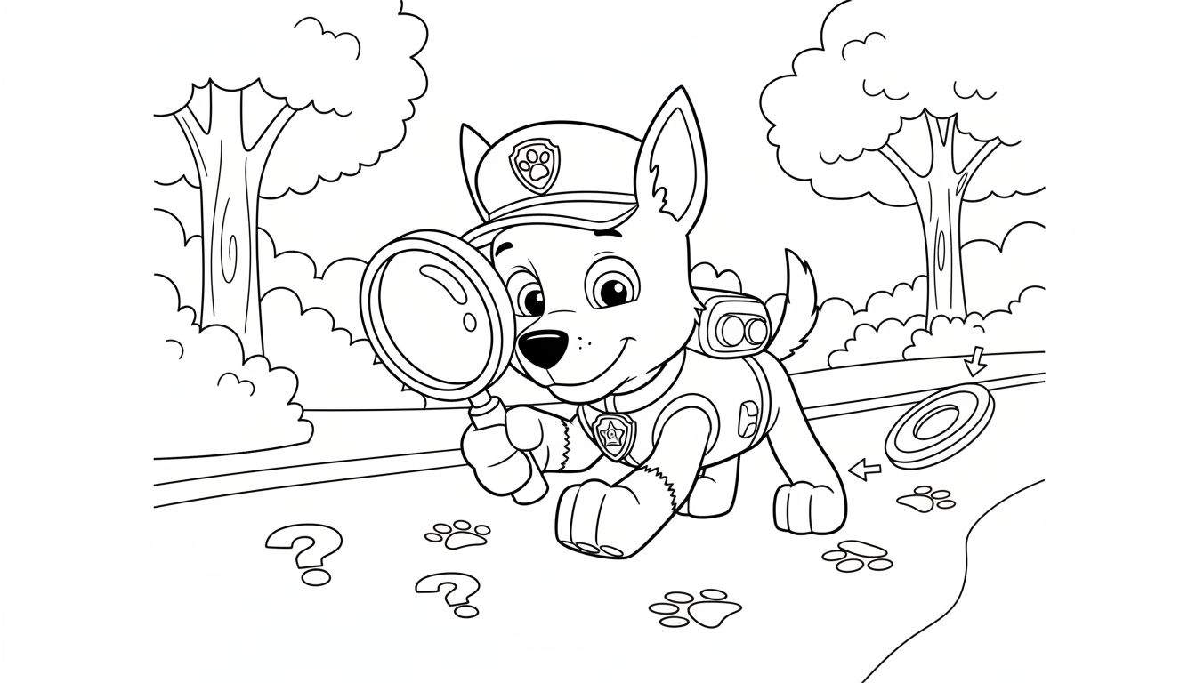Bereid je voor op een spannend avontuur met onze nieuwste Paw Patrol kleurplaat! Hier zien we Chase, de geliefde politiehond, in een geheel nieuwe rol: die van een scherpzinnige detective. Met zijn kenmerkende politiepet en rugzak is hij helemaal uitgerust om elk mysterie op te lossen. Gewapend met een groot vergrootglas speurt hij aandachtig de grond af, op zoek naar verborgen aanwijzingen in de natuurlijke omgeving vol bomen en struiken.