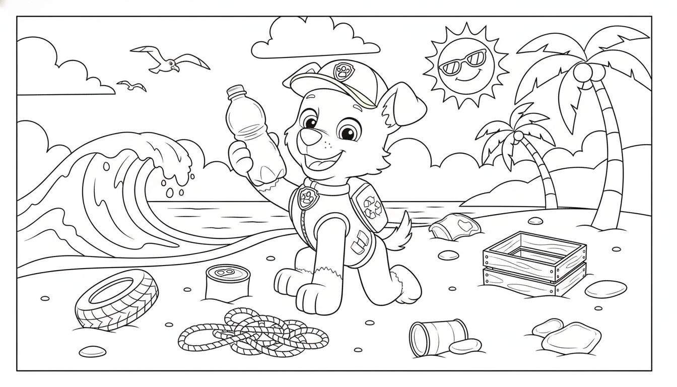 Rocky Paw Patrol Kleurplaat: Strand Opruimen & Recyclen Avontuur