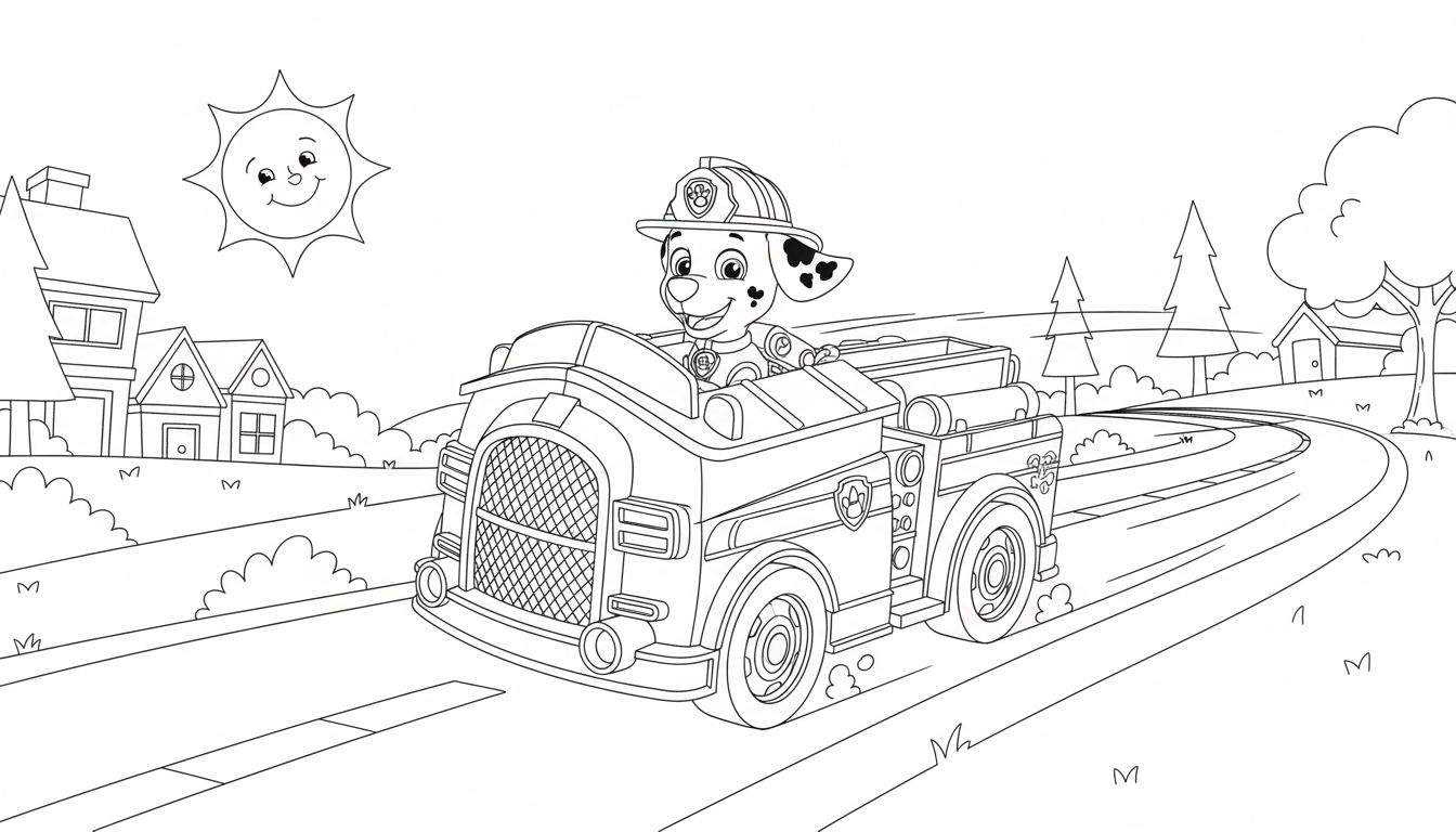 Marshall Paw Patrol Kleurplaat – Brandweerwagen in Landelijk Landschap