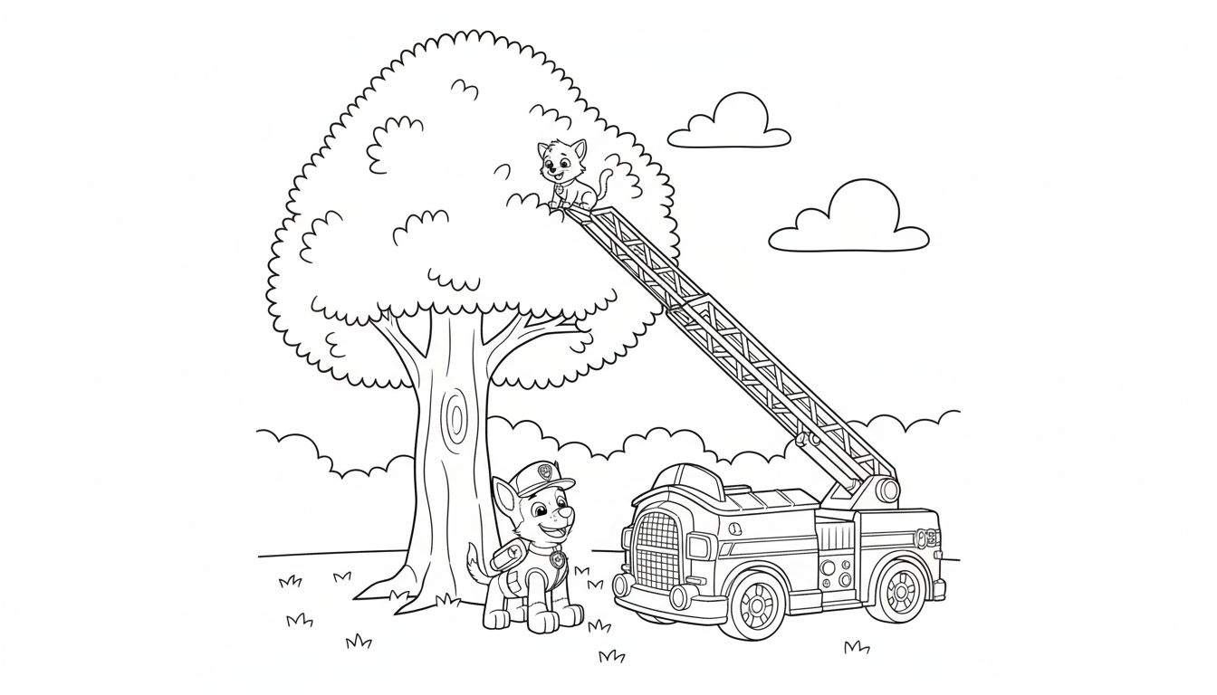 De kat zit hoog in de bladerrijke boom, veilig op de ladder, en kijkt blij en opgelucht naar beneden. Rechts staat de gedetailleerde brandweerwagen, klaar om Marshall en de kat weer veilig op de grond te brengen. Op de grond staat Marshall zelf, met zijn brandweerpet, glimlachend en vol trots. De achtergrond met gras, struikjes en twee wolken nodigt uit om levendige kleuren te gebruiken, waardoor het geheel tot leven komt. Deze kleurplaat is niet alleen leuk, maar leert kinderen ook over het belang van samenwerken en voor elkaar zorgen.